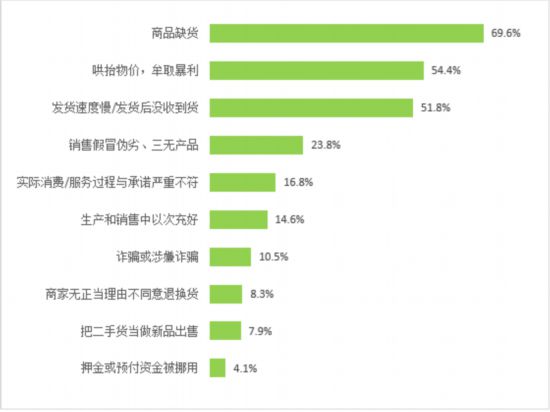 疫情期間,69.6%的受訪者主要遇到“商品缺貨”的消費問題;54.4%的受訪者遇到“哄抬物價,牟取暴利”,51.8%的受訪者遇到“發(fā)貨速度慢/發(fā)貨后沒收到貨”。