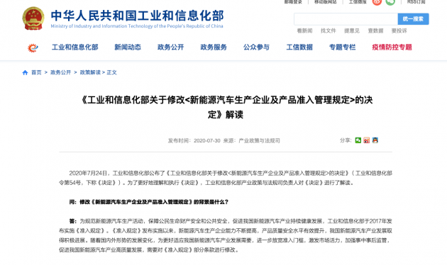 據(jù)悉,《工業(yè)和信息化部關于修改〈新能源汽車生產(chǎn)企業(yè)及產(chǎn)品準入管理規(guī)定〉的決定》已經(jīng)在2020年7月14日工業(yè)和信息化部第16次部務會議審議通過,現(xiàn)予公布,自2020年9月1日起施行。