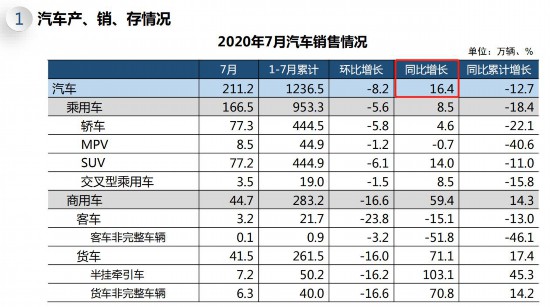 從2020年累計銷量情況看,1-7月,汽車產銷量分別為1231.4萬輛和1236.5萬輛,同比下降11.8%和12.7%,降幅與1-6月相比,分別收窄5.0個百分點和4.2個百分點。