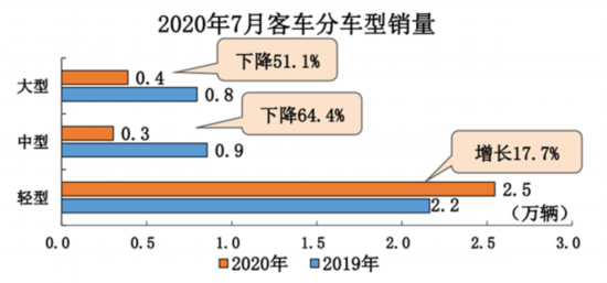 從細(xì)分車(chē)型來(lái)看,7月,大型客車(chē)銷0.4萬(wàn)輛,環(huán)比下降37.7%,同比下降51.1%;1-7月,大型客車(chē)銷2.7萬(wàn)輛,同比下降33.8%。中型客車(chē)銷0.3萬(wàn)輛,環(huán)比下降27.0%,同比下降64.4%;1-7月,中型客車(chē)銷2.0萬(wàn)輛,同比下降44.3%。輕型客車(chē)銷2.5萬(wàn)輛,環(huán)比下降21.9%,同比增長(zhǎng)17.7%;1-7月,輕型客車(chē)銷17.0萬(wàn)輛,同比下降1.7%。