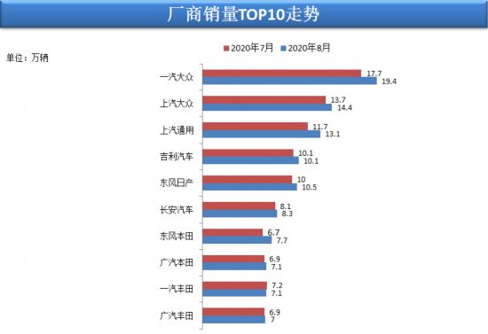 根據(jù)乘聯(lián)會(huì)數(shù)據(jù)顯示,狹義乘用車廠商8月銷量排行,前五位分別一汽大眾、上汽大眾、上汽通用,吉利汽車、東風(fēng)日產(chǎn),銷量分別為19.4萬輛、14.4萬輛、13.1萬輛、10.7萬輛和10.5萬輛。排名與7月相同,各廠商銷量均有所增長。
