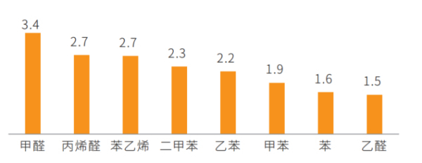 2022年度車內(nèi)空氣質(zhì)量測(cè)評(píng)結(jié)果顯示,常溫狀態(tài)下,除丙烯醛外,其余7種揮發(fā)性有機(jī)物均較2018-2021年有不同程度下降,一類致癌物甲醛和苯分別下降19.08%和65.10%,其余五種物質(zhì)也分別有22.42%至76.65%的下降。