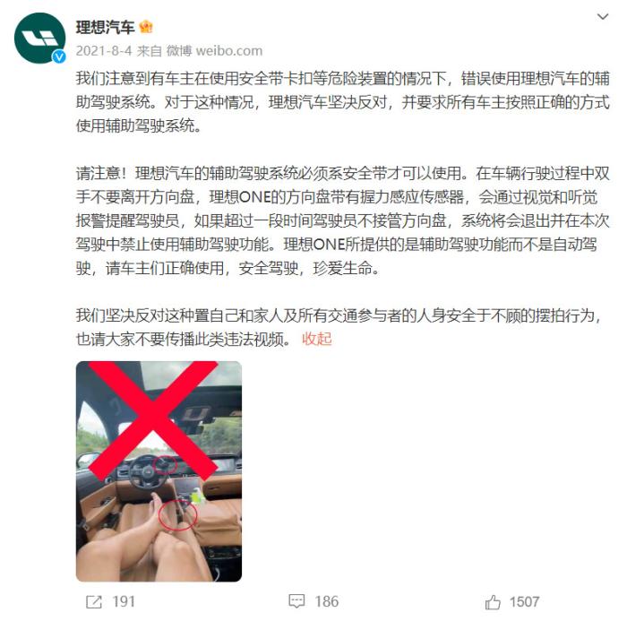 對(duì)此,理想汽車客服回應(yīng)稱,我們注意到,有用戶在社交媒體上展示了不文明的駕駛行為,他們繞過(guò)系統(tǒng)的監(jiān)測(cè),或在系統(tǒng)警告至緩?fù)似陂g進(jìn)行一系列危險(xiǎn)的操作。這是我們堅(jiān)決杜絕的。律師方面則表示,該行為不僅違反《中華人民共和國(guó)道路交通安全法》,更涉嫌以危險(xiǎn)方法危害公共安全。