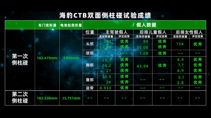 近期,國內汽車安全類測試欄目TOP Safety為驗證CTB技術對電動車安全性的意義,選擇了比亞迪海豹進行了一次新能源汽車雙面?zhèn)戎鲈囼?。該試驗通過模擬真實嚴苛的場景,來測試新能源汽車疊加兩次側柱碰后整車的被動安全性以及電池安全性。