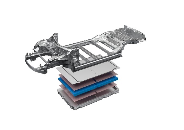 CTB技術以“電池車身一體化”為核心設計理念,并且在“蜂窩”中找到靈感,結合刀片電池獨有的長方體結構和超級強度,衍生出“類蜂窩鋁”結構,帶來電池成組技術里程碑式的革新,通過將刀片電池包與車身剛性連接,二為一形成完整體,將地板(電芯上蓋)-電芯-托盤三者與車身集成,形成高強度的“整車三明治”結構。