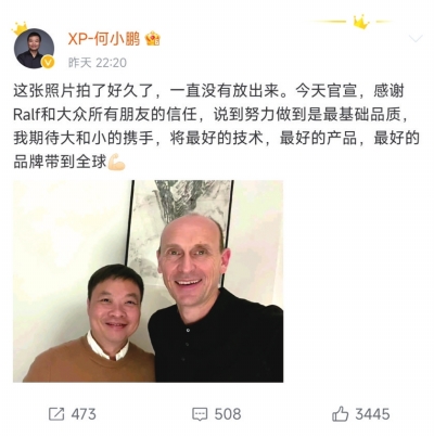 7月26日晚,小鵬汽車董事長(zhǎng)兼首席執(zhí)行官何小鵬發(fā)布微博放出了他和貝瑞德(Ralf?Brandstaetter)的合影。其在微博稱:“這張照片拍了好久了,一直沒有放出來。今天官宣,感謝Ralf和大眾所有朋友的信任,說到努力做到是最基礎(chǔ)品質(zhì),我期待大和小的攜手,將最好的技術(shù)、最好的產(chǎn)品、最好的品牌帶到全球?!?/p>