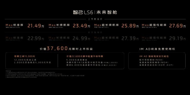 網(wǎng)通社快訊 10月12日,智己LS6正式上市,4款車型官方指導(dǎo)價(jià)為22.99萬-29.19萬元,上市期限時(shí)鉅惠立減1.5萬元。也就是說,“2023年11月12日24點(diǎn)前鎖單,并在2023年內(nèi)支付車款”的用戶,可享受限時(shí)售價(jià)區(qū)間為21.49萬-27.69萬元。另外,上市權(quán)益還包括:贈(zèng)送價(jià)值2.26萬元豪華配置升級(jí)特惠和IM AD終身免費(fèi)使用權(quán)。