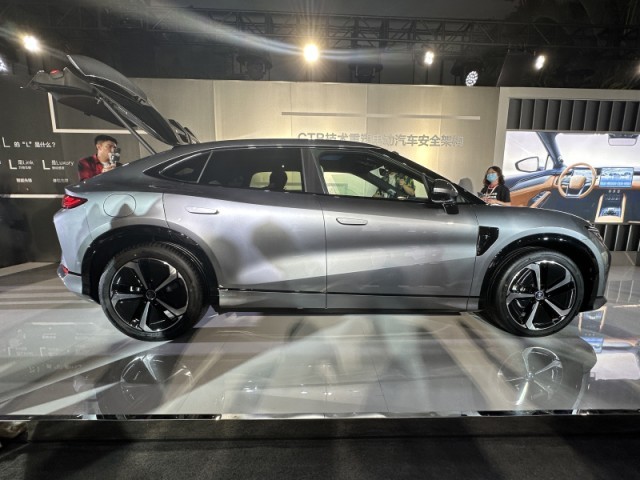 車身側(cè)面,新車采用溜背式設(shè)計,整體造型流暢且動感;無框式車門、隱藏式車門把手搭配大尺寸五輻式輪圈以及黑色輪眉裝飾,運動感極強。