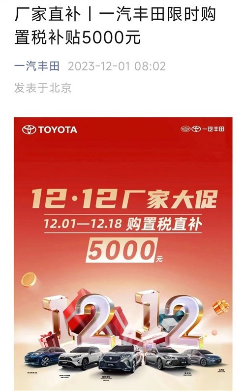 一汽豐田官微公告顯示,一汽豐田宣布開啟“雙十二大促”,12月1日至12月18日期間,購買格瑞維亞、RAV4榮放、皇冠陸放等部分車型限時享受購置稅補貼5000元,置換最高可享6000元置換補貼。