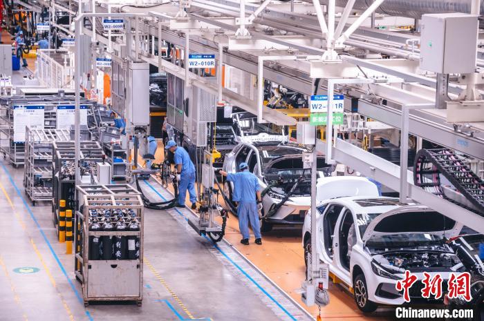 上汽集團(tuán)乘用車寧德基地里,工人在新能源汽車生產(chǎn)線上作業(yè)繁忙。中新網(wǎng)記者 李南軒 攝