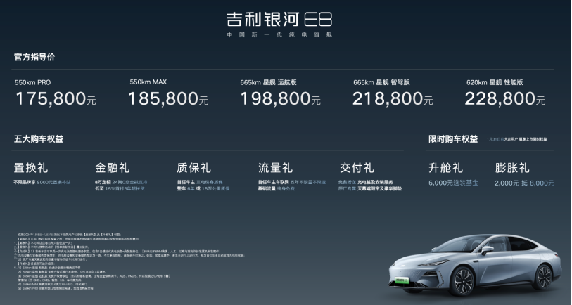 2024年1月5日,吉利汽車銀河E8上市并同步開啟交付。新車共推出5個版型,包括單電機后驅和雙電機四驅兩種動力系統(tǒng)及550公里、620公里和665公里三個續(xù)航版本,售價區(qū)間為17.58-22.88萬元。