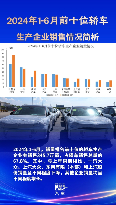 據(jù)中國汽車工業(yè)協(xié)會統(tǒng)計分析,2024年1-6月,銷量排名前十位的轎車生產(chǎn)企業(yè)共銷售345.7萬輛,占轎車銷售總量的67.8%。