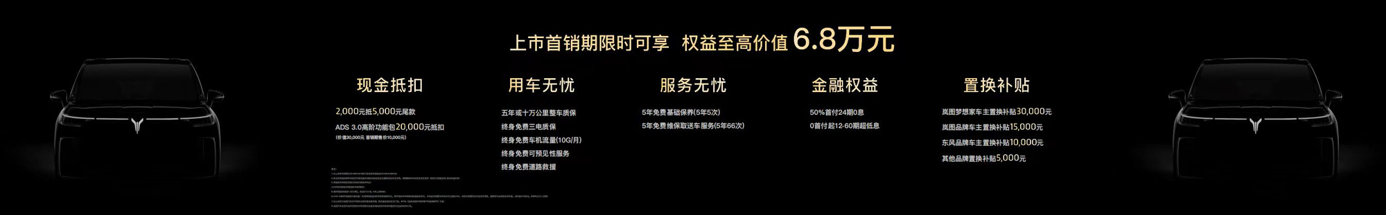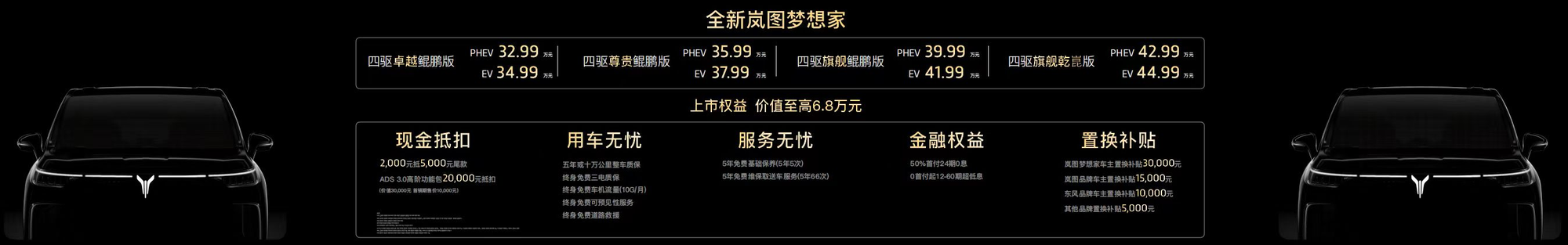 央廣網(wǎng)北京9月20日消息(記者 姜鵬)9月19日,以“感恩相伴 夢(mèng)想同行”為主題的東風(fēng)汽車(chē)感恩6000萬(wàn)用戶相伴暨全新嵐圖夢(mèng)想家上市發(fā)布會(huì)于武漢成功舉辦,全新嵐圖夢(mèng)想家正式上市并公布價(jià)格,其中,全新嵐圖夢(mèng)想家四驅(qū)卓越鯤鵬版PHEV 32.99萬(wàn)元、EV 34.99萬(wàn)元;全新嵐圖夢(mèng)想家四驅(qū)尊貴鯤鵬版PHEV 35.99萬(wàn)元、EV 37.99萬(wàn)元;全新嵐圖夢(mèng)想家四驅(qū)旗艦鯤鵬版PHEV 39.99萬(wàn)元、EV 41.99萬(wàn)元;全新嵐圖夢(mèng)想家四驅(qū)旗艦乾崑版PHEV 42.99萬(wàn)元、EV 44.99萬(wàn)元。同時(shí),截至10月10日,嵐圖還為用戶提供至高6.8萬(wàn)元的首銷(xiāo)期專(zhuān)享權(quán)益,包含2千元抵5千元現(xiàn)金抵扣,原價(jià)3萬(wàn)首銷(xiāo)期僅需1萬(wàn)元的ADS3.0高階智駕包;此外還有用車(chē)無(wú)憂、服務(wù)無(wú)憂、0息金融等權(quán)益;針對(duì)換購(gòu)的用戶還有至高3萬(wàn)元的置換補(bǔ)貼。