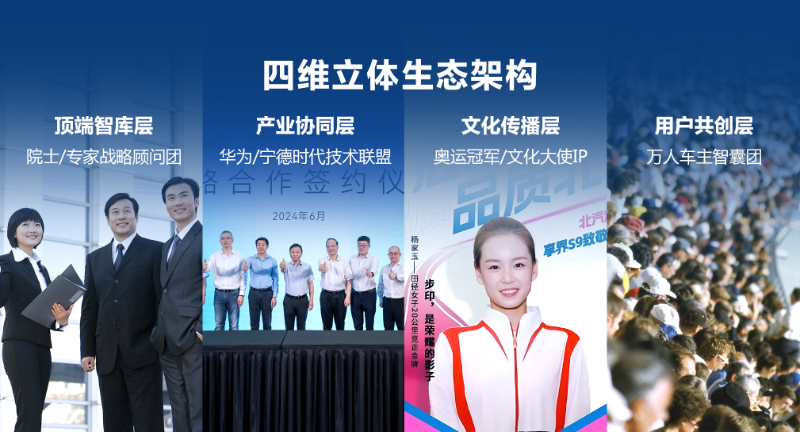 “品牌摯友計(jì)劃”是北汽集團(tuán)“品牌三年躍升行動(dòng)”的重要引擎,構(gòu)建一個(gè)“四維立體生態(tài)”:頂端智庫(kù)層,邀請(qǐng)?jiān)菏?、專家、?jīng)濟(jì)學(xué)家組成戰(zhàn)略顧問團(tuán);產(chǎn)業(yè)協(xié)同層,與華為、寧德時(shí)代等合作伙伴共建技術(shù)品牌聯(lián)盟;文化傳播層,攜手奧運(yùn)冠軍、文化名人打造"美好出行大使"IP;用戶共創(chuàng)層,建立萬(wàn)人級(jí)車主智囊團(tuán)。除了外部資源,品牌摯友計(jì)劃還將逐步拓展至20位內(nèi)部管理者及300名KOE員工。
