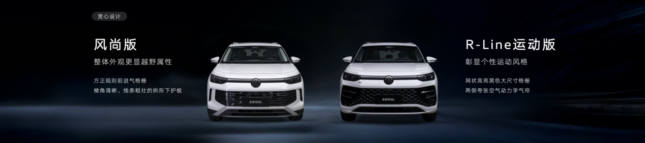 外觀造型上,為滿足當(dāng)下用戶多元化的審美需求,全新探岳L提供兩種前臉設(shè)計。其中,風(fēng)尚版車型的前臉方正且規(guī)則的進(jìn)氣格柵,輔以棱角清晰、線條粗壯的拱形下護(hù)板,整體外觀更顯越野屬性。相比之下,R-Line運動版則采用了品牌標(biāo)志性的網(wǎng)狀、高亮黑、大尺寸格柵,與兩側(cè)夸張的空氣動力學(xué)氣簾相得益彰,賦予車輛更凌厲氣質(zhì),充分彰顯個性運動風(fēng)格。