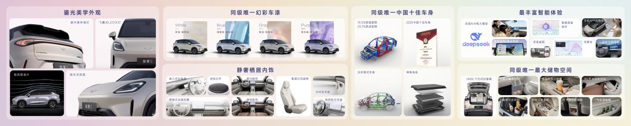步入“舒嶼座艙”,細(xì)節(jié)皆巧思。繽果S以“靜奢棲居美學(xué)”為靈感,通過環(huán)抱式布局、貫穿式內(nèi)嵌風(fēng)幕與柔感貝殼座椅等設(shè)計,營造出沉浸式的舒適氛圍。搭配同級唯一的6揚聲器系統(tǒng)與阿嘉米斯專業(yè)聲場調(diào)校,進一步提升了座艙的靜謐質(zhì)感與聽覺享受。12.8英寸高清大屏內(nèi)置“1+N”靈語AI中樞大模型,深度融合DeepSeek大模型,以更全面的壁紙玩法、八大區(qū)域的方言溝通、更多的智能場景應(yīng)用,為用戶帶來真正“更懂你的”智能座艙體驗。