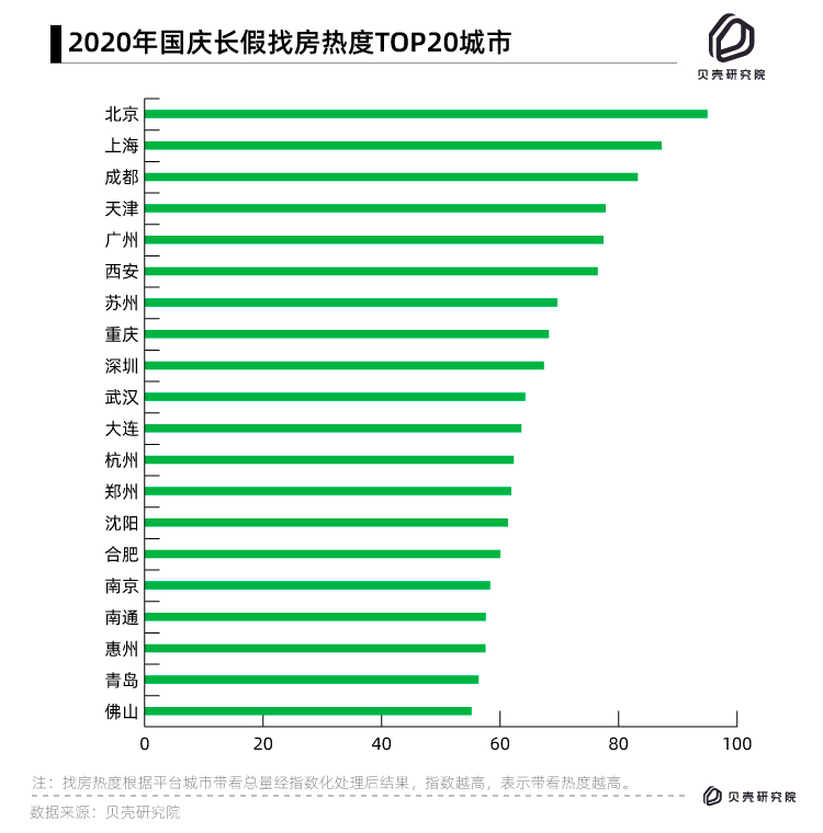 一個城市房產(chǎn)經(jīng)紀(jì)人帶客戶看房量——總帶看量,是衡量樓市熱度重要指標(biāo)。10月1日-7日,一線城市找房熱度高于新一線、二線城市。從城市之間熱度比較看,四個一線城市總帶看熱度指數(shù)為82.3,明顯高于新一線城市的61.9和二線城市52.6。