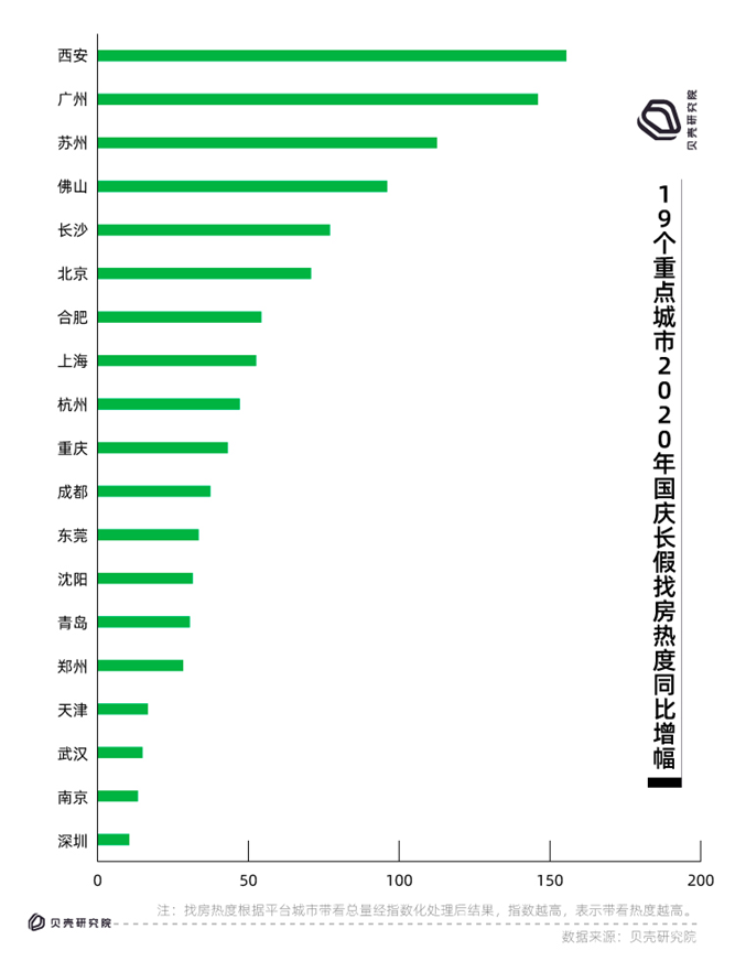 而深圳受調(diào)控政策影響,總帶看量同比僅增長10.5%,帶看增幅排在19個重點城市最后。同樣,在南京、武漢和天津,十一假期帶看量增幅排名靠后,同比漲幅未超過20%。