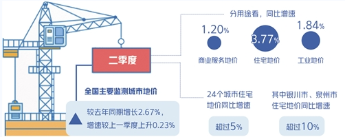 中國國土勘測規(guī)劃院日前發(fā)布的全國主要城市地價監(jiān)測報(bào)告顯示,二季度全國總體地價增速微漲。全國主要監(jiān)測城市地價較去年同期增長2.67%,增速較上一季度上升0.23%。