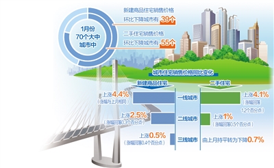 1月份,70個大中城市中,新建商品住宅和二手住宅銷售價格環(huán)比下降城市分別有39個和55個,比上月分別減少11個和8個。
