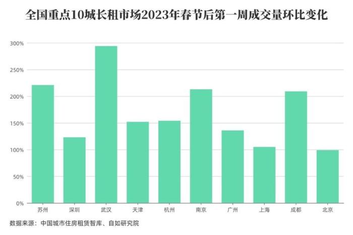 今年春節(jié)期間,中國的旅游、文娛、餐飲等市場明顯升溫,春節(jié)復(fù)工后隨著人員流動量增加。智庫和研究院方面認(rèn)為,住房租賃市場的穩(wěn)步回暖應(yīng)是趨勢。在長租市場成交量整體呈回升趨勢時,新一線城市的增長幅度明顯高于一線城市。智庫和研究院方面分析,環(huán)比春節(jié)前,北京、上海、深圳三大一線城市春節(jié)后第一周成交量環(huán)比提升近100%;而武漢、南京、成都等新一線城市環(huán)比成交量增長近200%,其中武漢增長約300%。