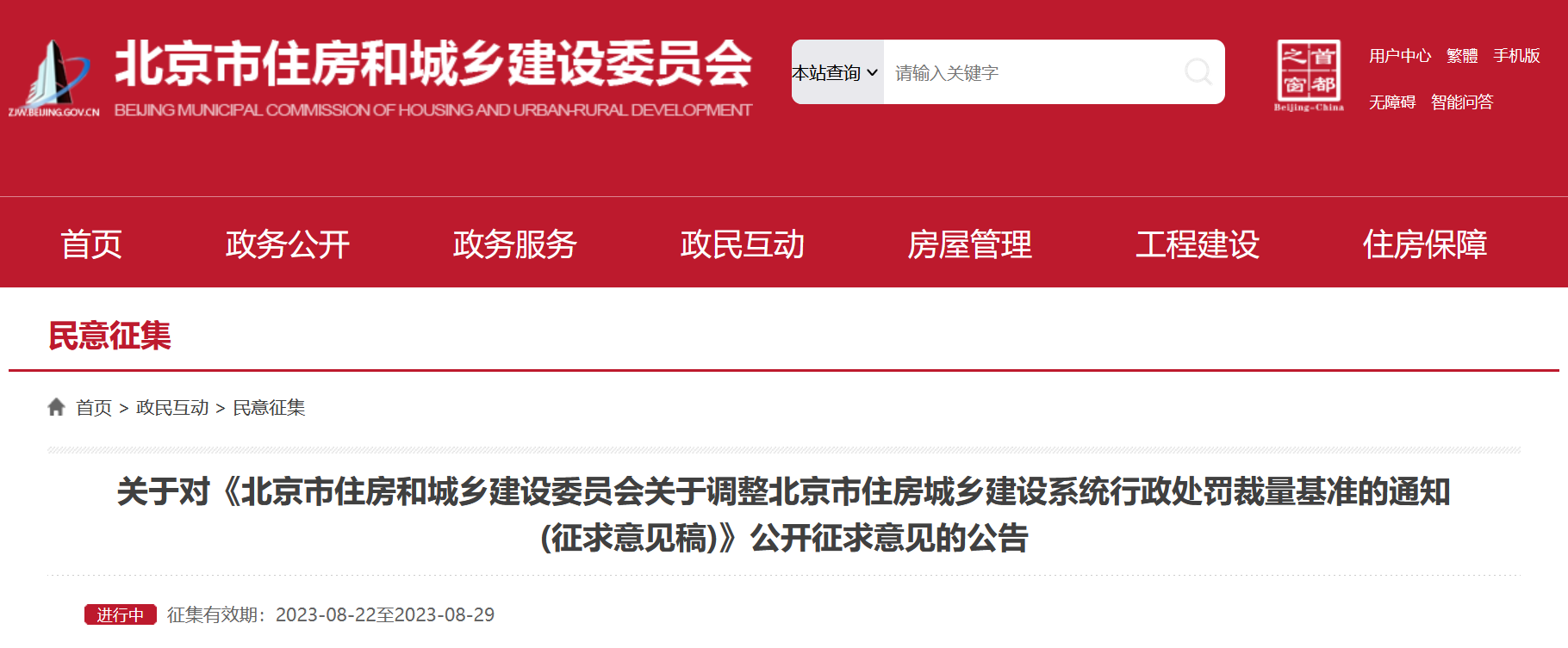 央廣網(wǎng)北京8月23日消息 據(jù)北京市住房和城鄉(xiāng)建設(shè)委員網(wǎng)站消息,為貫徹落實《建設(shè)工程質(zhì)量檢測管理辦法》《房地產(chǎn)開發(fā)企業(yè)資質(zhì)管理規(guī)定》相關(guān)處罰職權(quán),北京市住房和城鄉(xiāng)建設(shè)委員會制定了《北京市住房和城鄉(xiāng)建設(shè)委員會關(guān)于調(diào)整北京市住房城鄉(xiāng)建設(shè)系統(tǒng)行政處罰裁量基準的通知(征求意見稿)》,現(xiàn)向社會公開征求意見。公開征集意見時間為:2023年8月22日至8月29日。