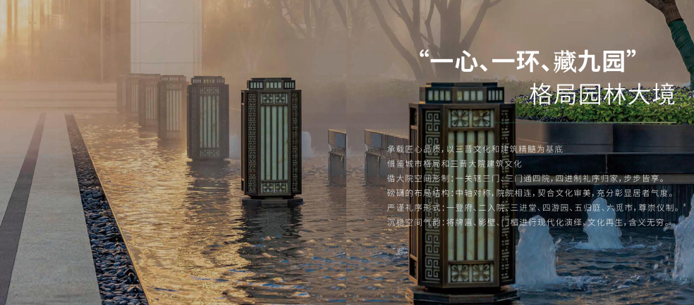 項(xiàng)目整體景觀設(shè)計(jì)以山林水源,禪意大宅為主線,將江南園林與皇家園林相結(jié)合,形成前府后院的園林形態(tài),景觀采用四級九景,四重栽植的造園手法,點(diǎn)綴了九個(gè)院落,四十個(gè)景點(diǎn)。園林鋪裝精致而具有設(shè)計(jì)感,在細(xì)節(jié)中加入特有的重視吉祥紋樣,更突出了新中式園林的設(shè)計(jì)風(fēng)格。
