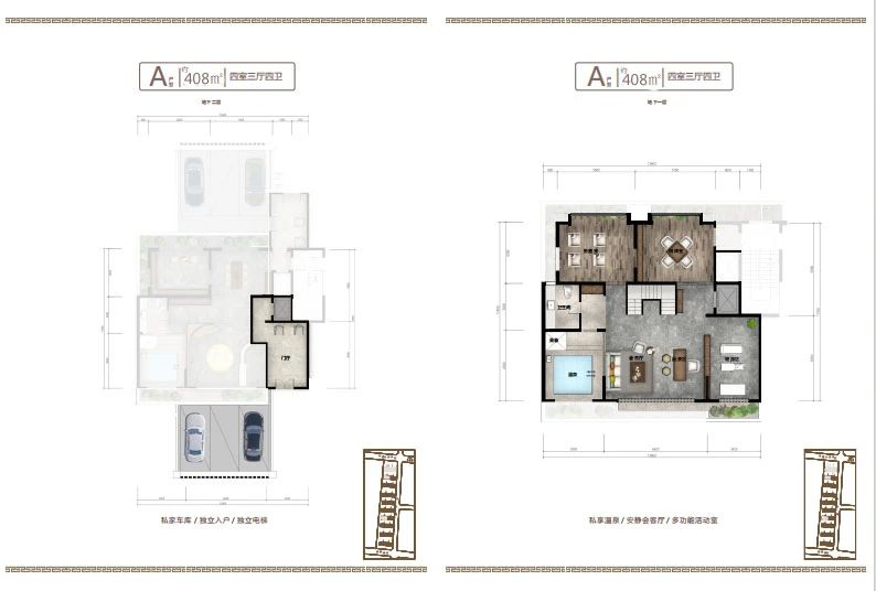 地下室設(shè)計(jì)不同于傳統(tǒng)地下室,只能為儲(chǔ)藏室使用,而小區(qū)地下室層高和地上建筑面積層高一致,達(dá)到了3.2米,沒有空間壓抑感,在南北庭院都設(shè)有1.2米的通風(fēng)采光井,室內(nèi)鋪設(shè)地暖及溫泉管道,上下水和衛(wèi)生間,私密性特強(qiáng),可以設(shè)計(jì)桑拿房,健身房,保姆間,洗衣房,酒窖及休閑娛樂等多功能區(qū)域,對于鄰居既不會(huì)產(chǎn)生噪音干擾,更不會(huì)打擾到家人的休息,在提高了生活品質(zhì)的同時(shí)也不會(huì)由空間局促感,地下室可以直通地下私家車庫,車庫層高4.2米,寬約7-10米,至少可以容納家用汽車三輛。