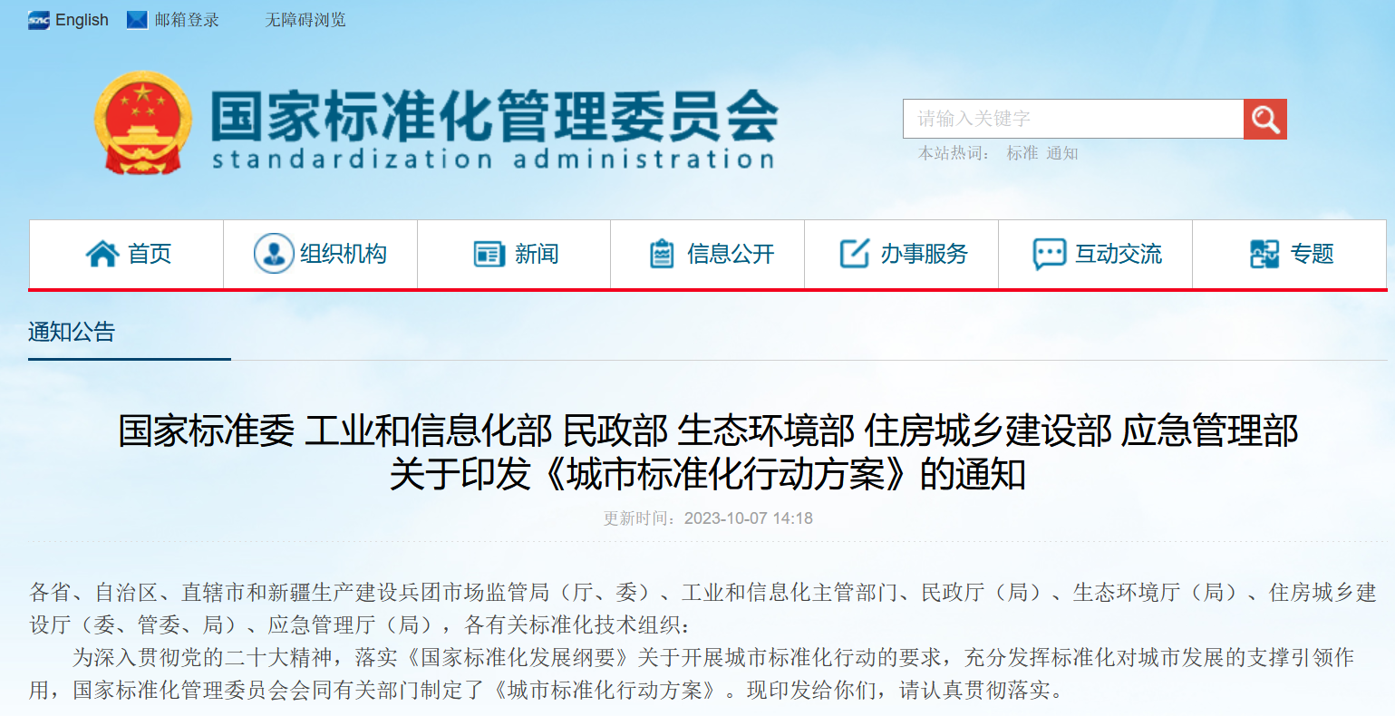 央廣網(wǎng)北京10月8日消息 據(jù)國家標準化管理委員會網(wǎng)站消息,為落實《國家標準化發(fā)展綱要》關(guān)于開展城市標準化行動的要求,充分發(fā)揮標準化對城市發(fā)展的支撐引領(lǐng)作用,近日,國家標準化管理委員會會同工業(yè)和信息化部、民政部、生態(tài)環(huán)境部、住房城鄉(xiāng)建設部、應急管理部制定了《城市標準化行動方案》(以下簡稱《行動方案》)。