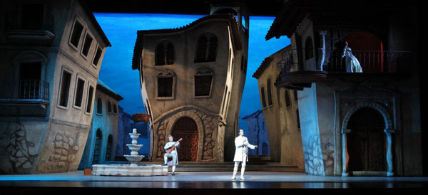 7月13日當晚,隨著歌劇指揮莫蘭迪引領(lǐng)國家大劇院管弦樂團奏出《塞維利亞理發(fā)師》膾炙人口的序曲旋律,大幕拉開,由著名舞臺設(shè)計師張武設(shè)計的“高迪建筑風格”的塞維利亞小鎮(zhèn)展現(xiàn)在觀眾面前。