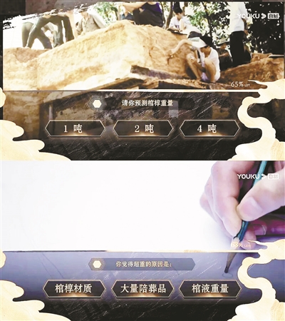 紀(jì)錄片相對(duì)小眾,知識(shí)性遠(yuǎn)遠(yuǎn)大于娛樂性,尤其是有些作品中知識(shí)呈現(xiàn)方式的無趣加深了與大眾的隔閡,最后知識(shí)的傳達(dá)率也難以考察。但在互動(dòng)紀(jì)錄片中,知識(shí)的接受甚至變成一種強(qiáng)制性的沉浸行為,因?yàn)橛^眾自己必須做選擇題。比如《古墓派·互動(dòng)季》中重回當(dāng)年的考古現(xiàn)場(chǎng),你是“就地開棺”還是“運(yùn)回實(shí)驗(yàn)室”?甚至還有一些更專業(yè)的互動(dòng),在第三集《致命死因》中,觀眾需要判斷這兩具尸體的死因,究竟是死于吞金、投毒,還是別的原因呢?不同的選擇會(huì)觸發(fā)不同的劇情或者醫(yī)學(xué)解讀。