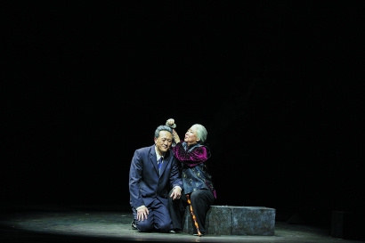 這一幕開場時,先是潮汕英歌舞——潮汕民間流傳的懲惡揚善、吉祥平安的舞蹈。接著,一頭白發(fā)的黃旭華偕妻登場。臺口,另一位拄著拐杖、顫顫巍巍的老太太向他凝望。這就是黃旭華的老母親,她言語不多,不時以拐杖重擊地板,表達澎湃的心情。黃旭華拿出當年母親留給他的銀梳子,想跪下來給母親梳頭。誰料,母親激動地說:“我就知道兒子沒有忘記我!”她反而說,要替兒子梳頭。因為她明白:“對祖國的忠,就是對父母最大的孝。”