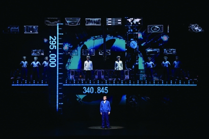舞美設計,不僅凸顯主題,也具有形式美——圓環(huán)外框勾勒出潛水艇橫切面的弧度,內(nèi)里的十字鋼鐵結(jié)構(gòu),可以成為甲板欄桿、書房頂梁等等。在展現(xiàn)深潛之際,舞臺周圍的一圈冰屏,則好似儀表盤,時而穩(wěn)定時而模糊……