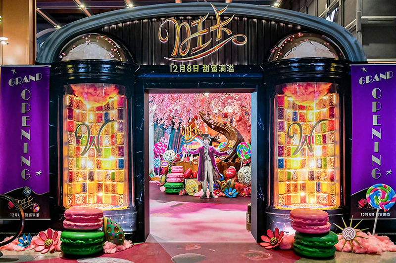 《旺卡》首映禮現(xiàn)場的設(shè)計(jì)獨(dú)具巧思,直接將電影中的旺卡巧克力店“搬到”影城。觀眾手持旺卡巧克力店“開業(yè)”邀請函,穿過大門,就步入旺卡巧克力店,正式開啟繽紛奇趣的童話世界,令人一秒忘記所有煩惱。