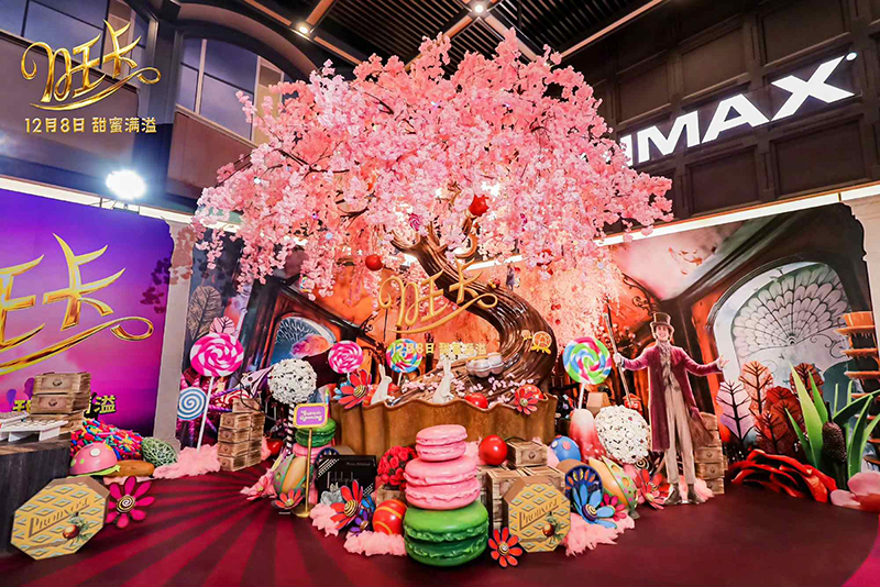 首映現(xiàn)場,最引人注目的當(dāng)屬電影里標(biāo)志性的巧克力櫻花樹。片中,旺卡在粉色櫻花樹下漫灑巧克力糖果,夢幻爛漫,猶如童話仙境。而在首映禮現(xiàn)場,這棵櫻花樹也被完美復(fù)刻,櫻花樹四周堆滿各色巧克力糖果和花朵,令觀眾可以親身走入巧克力“花?!?,成為當(dāng)天的打卡點(diǎn)。