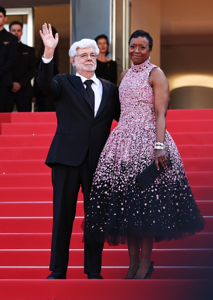 5月25日,在法國南部城市戛納舉行的第77屆戛納電影節(jié)上,美國導(dǎo)演、編劇、制片人喬治·盧卡斯(右)抵達(dá)閉幕式紅毯。新華社記者 高靜 攝
