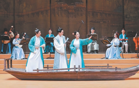 北京民族樂團玖樂室內(nèi)樂組合擔(dān)任現(xiàn)場演奏,24首樂曲穿插在劇情中,訴盡人世間的離合悲歡。這些音樂作品既有傳統(tǒng)古曲,也有改編自影視音樂的當(dāng)代作品片段,與劇情故事的發(fā)展嚴(yán)絲合縫地呼應(yīng)。玖樂室內(nèi)樂組合的成員身穿宋制服裝,坐在舞臺后方,與舞臺正中央的一葉孤舟呼應(yīng),讓《人生的盛宴》的舞臺有如古畫。民樂室內(nèi)樂的現(xiàn)場演奏不僅僅是伴奏或添彩,更是劇目呈現(xiàn)不可或缺的一部分。