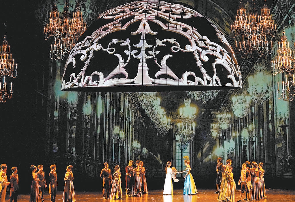 與壯闊宏大的作品立意相匹配的,是當(dāng)?shù)闷鹑A美二字的舞臺呈現(xiàn)。璀璨的吊燈、長長的樓梯等鮮明意象不斷出現(xiàn),簡潔的布景與流動的影像虛實(shí)交織,把輝煌的宮廷、幽靜的鄉(xiāng)村、無垠的星空等場景營造得深邃動人。其中,由多塊LED屏拼成的圓弧最引人注目,在舞美設(shè)計維亞切斯拉夫·奧庫涅夫的解讀中,和平的寧靜短暫降臨時,圓弧可以隨影像變幻為宮殿穹頂、簡潔的花園涼亭,為生活遮風(fēng)擋雨;戰(zhàn)爭襲來,刺目的紅光從破裂崩碎的圓弧中迸濺而出,恰如滿目瘡痍、生靈涂炭的現(xiàn)實(shí)。最終,幾瓣圓弧拼成碧水青山的“地球”,呼應(yīng)原著小說標(biāo)題中的俄語單詞“Mip”,即“世界”,將作品的意境再次推上新的高點(diǎn)。