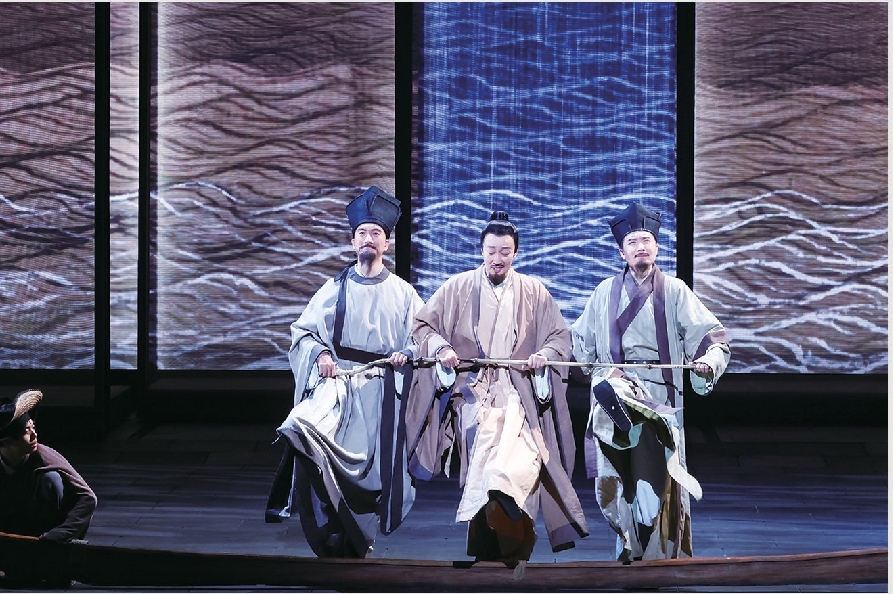 記者:舞臺(tái)上有一場(chǎng)戲堪稱絕妙:一葉扁舟上,蘇軾、王安石、司馬光三人上演的“盜夢(mèng)空間”式“跨越時(shí)空”的對(duì)話,比如處理水患災(zāi)情時(shí),蘇軾要召開(kāi)新聞發(fā)布會(huì),甚至說(shuō)要開(kāi)直播……這些看似隨意甚至荒唐的表達(dá)和演繹,給觀眾帶來(lái)一種新鮮的、自由開(kāi)放的演劇體驗(yàn)觀。劇中有借鑒中國(guó)戲曲中的可變性、流動(dòng)性、空間結(jié)構(gòu),也有借鑒西方戲劇的多種技巧,這樣非線性、開(kāi)放式敘事結(jié)構(gòu),有著怎樣的匠心?