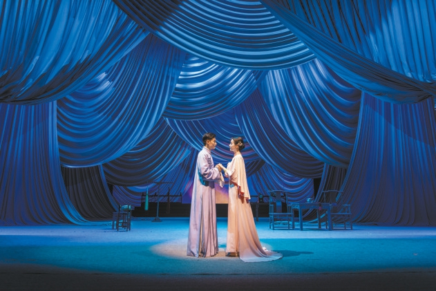 近日,北京人民藝術(shù)劇院再次排演該劇,以意象化手段賦予劇中男女主人公的愛情以詩意——不但在兩人交談時(shí)加入了許多戲曲身段,更加入了新的臺(tái)詞強(qiáng)化兩人的愛慕之情;結(jié)尾以一段雙人舞展現(xiàn)兩個(gè)自由的靈魂在虛空中的相會(huì);不時(shí)出現(xiàn)的昆曲《牡丹亭》作為背景音樂,昭示兩人超越生死的愛戀。