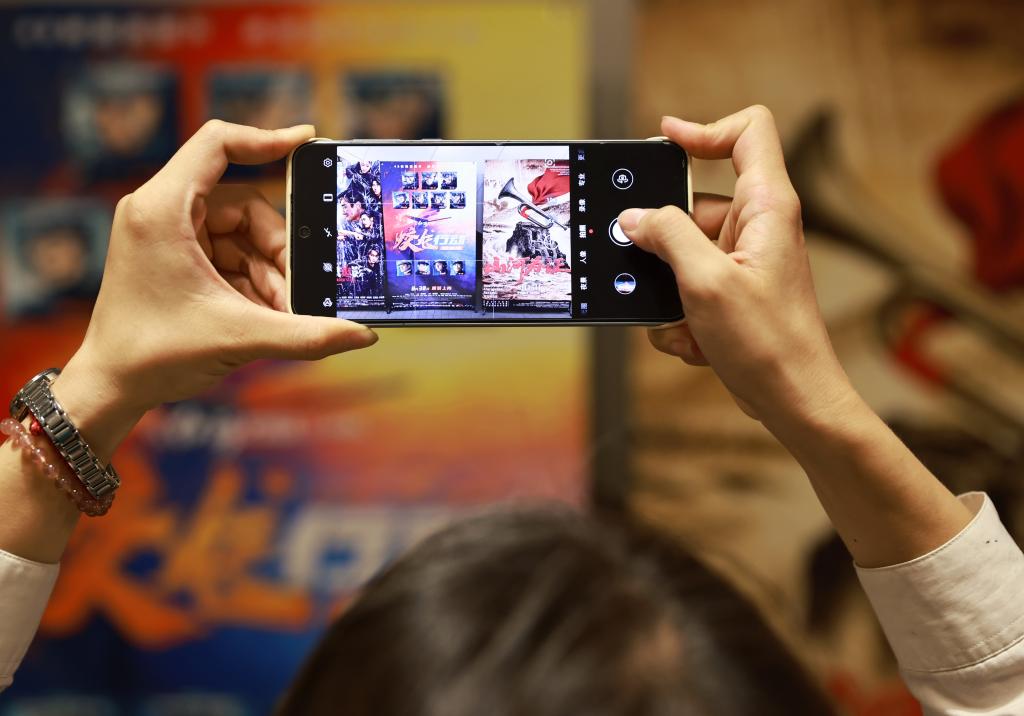 8月31日,在湖北省武漢市江岸區(qū)一家影城,觀眾拍攝近期上映的電影海報。新華社發(fā)(趙軍攝)