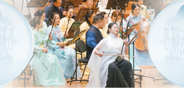 演出由知名華人指揮家湯沐海執(zhí)棒,來自上海民族樂團(tuán)的70余位演奏家一同奏響華章?!昂I仙駱贰狈忠魳窌?huì)版和上海音樂廳駐場(chǎng)版,前者偏向西方當(dāng)代交響音樂會(huì)的制式,后者則融入多媒體光影,更傾向于沉浸式音樂現(xiàn)場(chǎng)。因而,曲目會(huì)根據(jù)現(xiàn)場(chǎng)環(huán)境和觀眾特征做適當(dāng)調(diào)整。國外演出時(shí),會(huì)增加二胡與樂隊(duì)合奏的《臥虎藏龍》(見上圖)——這是東西方觀眾都熟悉,甚至?xí)谘矍案‖F(xiàn)出竹林搖曳畫面的曲目。音樂會(huì)版在編曲上的處理會(huì)在尾聲處以漸強(qiáng)手法處理中西樂器的合奏共鳴,把情感推向高潮。琵琶、京胡與樂隊(duì)合奏的《楚漢》中,俞冰的琵琶獨(dú)奏氣勢(shì)不凡,凸顯出西楚霸王的威武。嗩吶與樂隊(duì)合奏《鳳舞》時(shí),胡晨韻不僅能吹出一個(gè)超乎常人想象的長(zhǎng)音,還能與笛子手等一起營造一群鳥兒的生動(dòng)“對(duì)話”,時(shí)而平和時(shí)而激動(dòng),惹得觀眾忍俊不禁。而改編自膾炙人口的《野蜂飛舞》的民樂重奏《蜂飛》則賦予俄羅斯作曲家里姆斯基-科薩科夫的經(jīng)典名曲“中華風(fēng)韻”——眼見著民族樂器在王音睿、趙臻、丁龍等掌控的打擊樂、笙和二胡的樂音中展現(xiàn)出妙趣橫生的“畫面”。而開場(chǎng),金鍇與趙韻夢(mèng)領(lǐng)銜的竹笛與樂隊(duì)合奏《湖光》則凸顯出江南文化的音樂聲色。