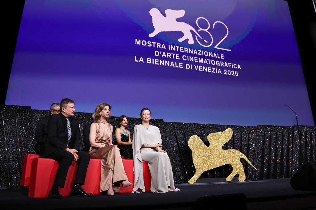 9月6日,在意大利威尼斯,主競(jìng)賽單元評(píng)委出席閉幕式。新華社記者 李京 攝