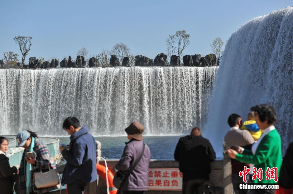 1月5日,游客在昆明瀑布公園內(nèi)游覽拍照。據(jù)了解,昆明瀑布公園1月1日開始對(duì)民眾開放,公園的瀑布利用牛欄江引水入滇工程而形成人工瀑布及湖泊,其利用約12.5米的地勢(shì)高差,建設(shè)成寬幅約400米的人工瀑布,是中國(guó)最大人工瀑布。 中新社記者 任東 攝