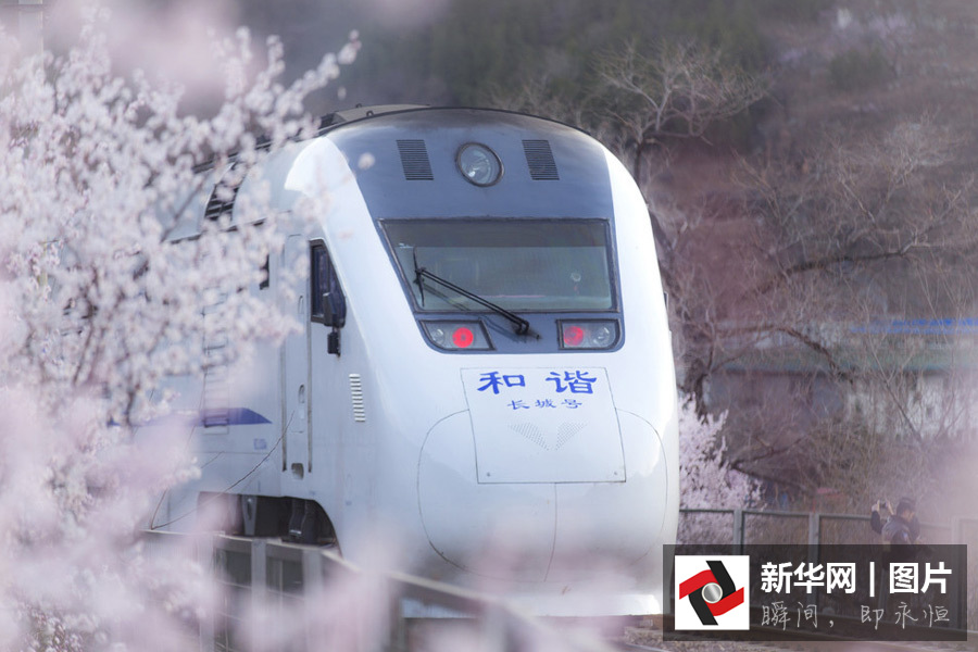 2016年3月23日,中國北京,又到一年花開時(shí),數(shù)京城最美的鐵路景色還看京張鐵路居庸關(guān)。漫山遍野的桃花盛開,S2雪白的列車穿行其中,美不勝收。圖片來源:東方IC