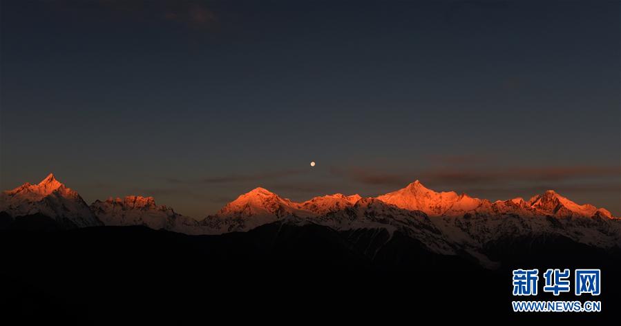 這是3月25日清晨拍攝的梅里雪山“日月同輝”景觀。梅里雪山位于滇藏交界的云南省迪慶藏族自治州德欽縣境內(nèi),是世界自然遺產(chǎn)“三江并流”的主要自然景觀之一。梅里雪山常年云霧籠罩,太陽光只在少數(shù)天晴的清晨照射在雪山頂上,形成絕美的“日照金山”美景。有時(shí)月亮尚未落山,太陽已經(jīng)升起,更是形成了難得一見的梅里雪山“日月同輝”奇觀。新華社記者 王長(zhǎng)山 攝