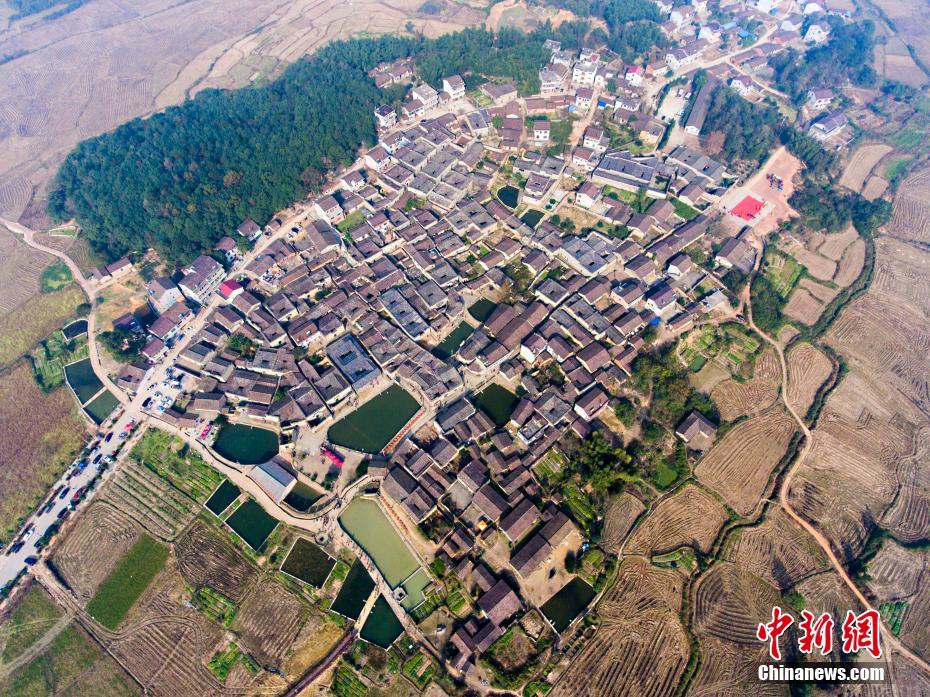 12月10日,航拍位于江西金溪縣有著600多年歷史的中國歷史文化名村、中國傳統(tǒng)村落竹橋古村,俯瞰全村,形似一柄巨扇。該村現(xiàn)保存有明代所建民居8幢,明代祠堂1幢,其余為清代建筑,青磚灰瓦,樸實(shí)素雅,為贛派建筑最典型的代表。村前溪水長流,良田萬頃,村后茂林修竹,鳥鳴樹幽,身歷其境,如入畫中。傅建斌 攝