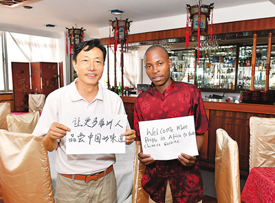 2月8日,在肯尼亞首都內羅畢一家中國餐廳,餐廳經營者祁溥瑩(左)和同事帕特里克·奧根切·奧托托展示各自的新年心愿。