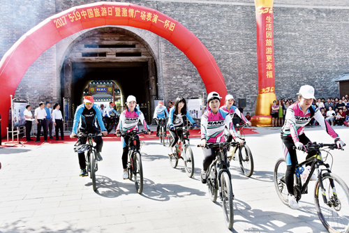 活動中,旅行社代表發(fā)言,旅行社導(dǎo)游集體宣誓,旅行社負(fù)責(zé)人和導(dǎo)游集體簽署文明旅游承諾書。啟動了捷安特騎行隊騎游??h文化藝術(shù)館舉辦了“激情廣場表演——懷舊專場”演出,節(jié)目有舞蹈、獨唱、晉劇選段、吉他彈奏、勁舞、歌伴舞、詩朗誦、水兵舞、旗袍秀等,贏得現(xiàn)場觀眾陣陣熱烈的掌聲,將“5·19中國旅游日”宣傳活動推向了高潮。圖為捷安特騎行隊出發(fā)騎游(石俊文 攝影報道)