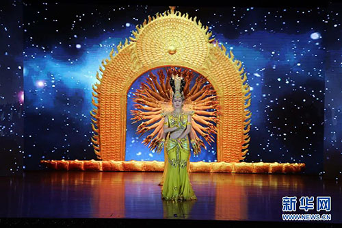 1月30日,在柬埔寨金邊,來自中國殘疾人藝術(shù)團(tuán)的演員在表演《千手觀音》。